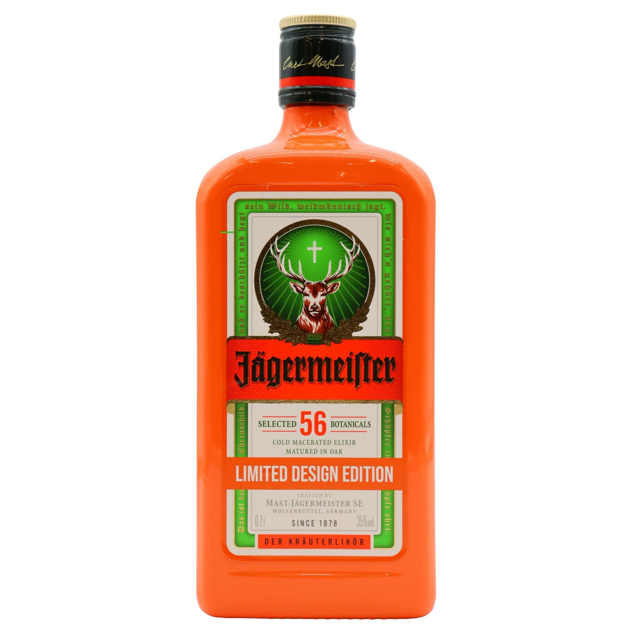 Jägermeister Herbal Liqueur Culture Orange Edition is a limited release that keeps the iconic 35% ABV German digestif formula intact and wraps it in a vivid Culture Orange (Pantone 7878 C) bottle. A tribute to Jägermeister's cultural footprint in music, nightlife, and hospitality worldwide, the Orange Edition is built to be displayed — and to be poured.