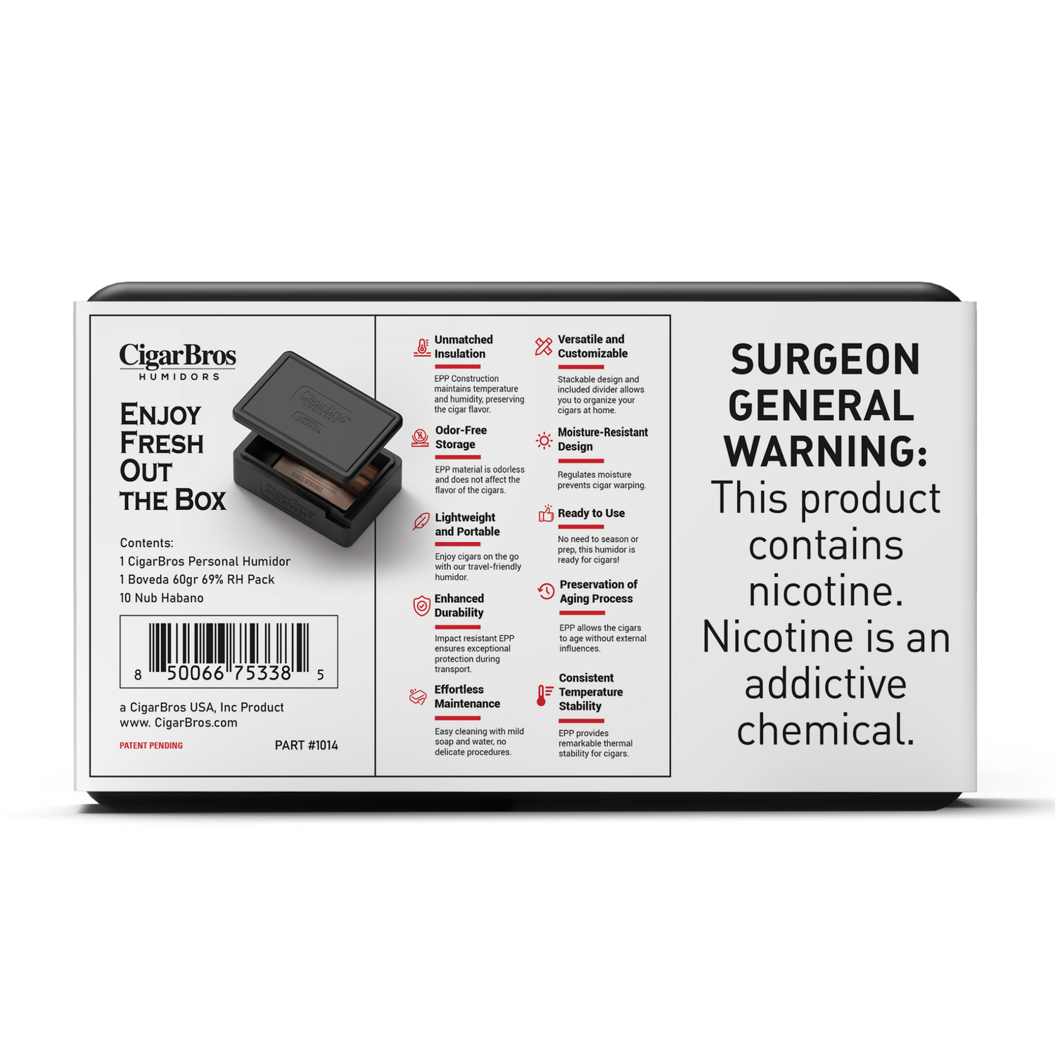 Expertly constructed using 100% Nicaraguan tobaccos, the Nub Habano is known for its intensity, balance, and rich, spicy finish. The 20-count set is complemented by the CigarBros Personal Humidor, designed to preserve the freshness and strength of your cigars whether at home or on the move.